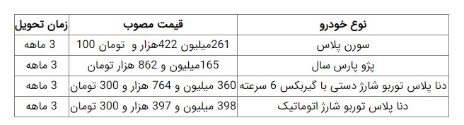 بر اساس گزارش خودرو بانک، ﻃﺮﺡ ﭘﻴﺶ ﻓﺮﻭﺵ ﻋﺎﺩی (ﺑﺎ ﻣﻮﻋﺪ ﺗﺤﻮﻳﻞ ﺣﺪﺍﻛﺜﺮ ۱۲ ﻣﺎﻫﻪ) ﺑﺮخی ﻣﺤﺼﻮﻻﺕ ﺷﺮﻛﺖ ﺍﻳﺮﺍﻥ ﺧﻮﺩﺭﻭ (ﺑﺎ ﺭﻭﺵ ﻗﺮﻋﻪ کشی) ﻭ ﻣﻄﺎﺑﻖ ﺟﺪﻭﻝ ﺫﻳﻞ ﺍﺯ ﺭﻭﺯ ﺳﻪ ﺷﻨﺒﻪ ﻣﻮﺭﺥ ۱۴۰۱/۰۷/۱۲ ﺷﺮﻭﻉ ﻭ ﺑﻪ ﻣﺪﺕ ۴ ﺭﻭﺯ ﺍﺩﺍﻣﻪ ﺧﻮﺍﻫﺪ ﺩﺍﺷﺖ.