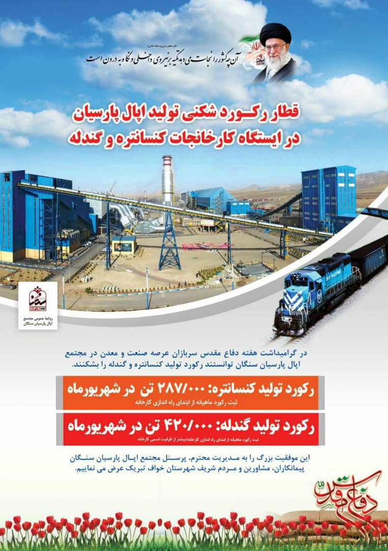 همزمان با هفته دفاع مقدس و در راستای منویات مقام معظم رهبری مبنی بر تولید، پیشتیبانی و مانع زدایی ها، سربازان جبهه اقتصادی اپال پارسیان، توانستند رکورد ماهیانه کنسانتره و گندله را بشکنند.