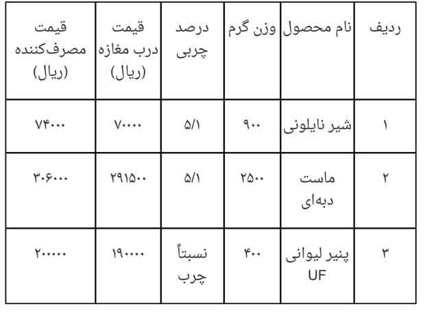 عطف به نامه شماره ۱۲۸۸۱ – ۱۴۰۰ مورخ ۱۴۰۰/۷/۱۴ دبیر محترم انجمن صنایع فرآورده‌های لبنی ایران و با عنایت به مصوبات جلسه روز دوشنبه ۱۴۰۰/۷/۱۲ در دفتر معاونت برنامه‌ریزی و امور اقتصادی وزارت متبوع با حضور نمایندگان محترم فروشگاه‌های زنجیره‌ای و انجمن صنایع لبنی و تصمیم متخذه در تخفیف ۱۰ درصدی قیمت مصرف‌کننده سه قلم کالای لبنی، مقتضی است دستور فرمائید از روز شنبه ۱۴۰۰/۰۷/۱۷ برای سه قلم کالای مندرج در جدول زیر قیمت‌های جدید عملیاتی گردد.