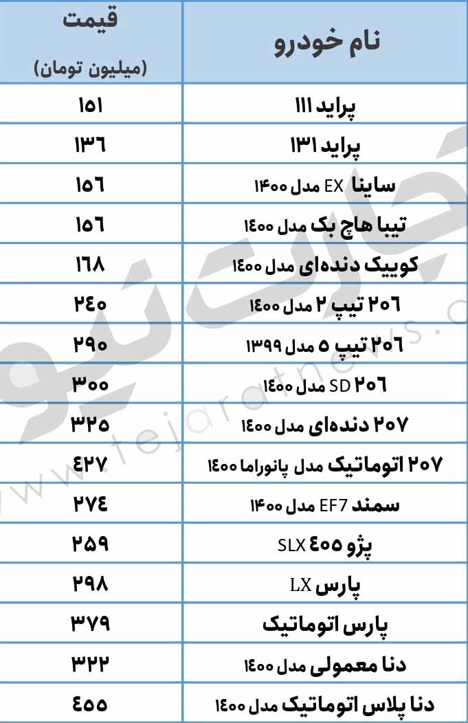 خودروهای پژو، تیبا و دنا افزایش قیمت داشتند. پژو ۲۰۶ تیپ ۲ مدل ۹۹ به ۲۳۰ میلیون تومان کاهش یافت. خودرو پژو ۲۰۷ دندهای مدل ۱۴۰۰ به ۳۲۱ میلیون تومان کاهش پیدا کرد. پژو پارس LX از دیگر خودروهای گروه پژو بود که روند صعودی قیمت داشت و به قیمت ۲۹۸ میلیون تومان رسید.
