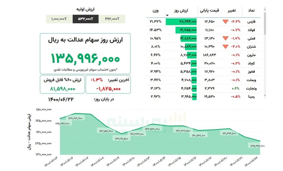 ارزش سهام عدالت امروز ۲۲ شهریورماه نسبت به روز گذشته ۱.۳درصد کاهش یافت.
