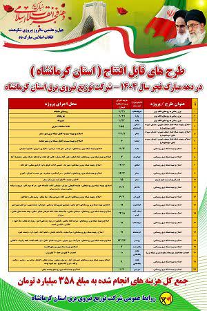 مدیرعامل شرکت توزیع نیروی برق استان کرمانشاه از افتتاح ۲۲ پروژه با اعتباری بالغ بر ۳۵۸ میلیارد تومان به مناسبت دهه مبارک فجر در استان کرمانشاه خبر داد.