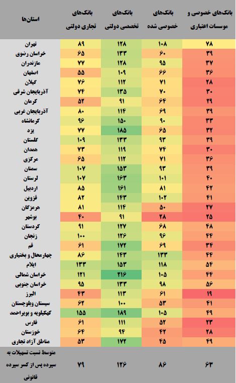 لازم به ذکر است، در جدول یاد شده رنگ سبز نشانگر نسبت تسهیلات به سپرده بالاتر و رنگ قرمز نشانگر نسبت تسهیلات به سپرده پایین تر است.