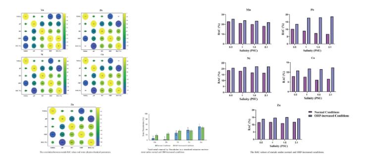 وی با بیان اینکه این تفاوتها نشان میدهد که شوری و ORP تأثیر متقابلی بر فرایند فلکولاسیون دارند و رفتار هر فلز به ویژگیهای شیمیایی آن وابسته است، گفت: «تحرک فلزات در رسوبات نیز تحت تأثیر ORP و pH قرار گرفت. افزایش ORP یا کاهش pH باعث افزایش تحرک فلزات شد و ترتیب تحرک به صورت Mn > Ni > Zn > Pb > Cu مشاهده شد».