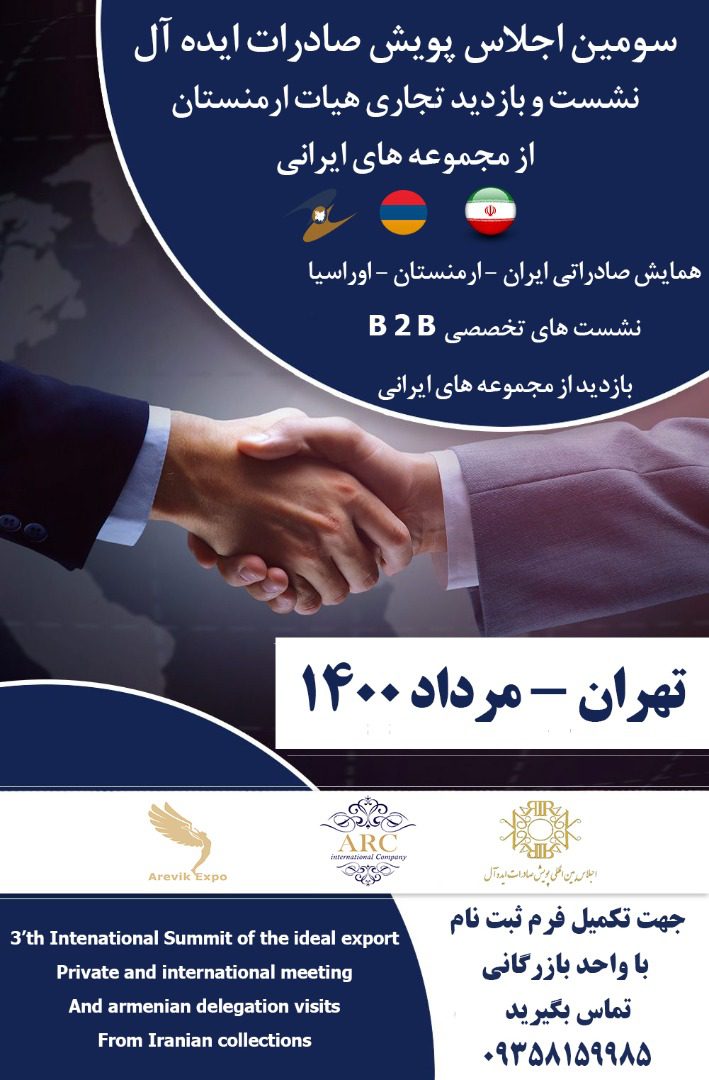سومین اجلاس پویش صادرات ایده آل بصورت نشست تخصصی با هیات تجار از کشور همسایه و عضو اتحادیه اوراسیا کشور ارمنستان در پایتخت ایران شهر تهران در مرداد ماه ۱۴۰۰ برگزار می شود.