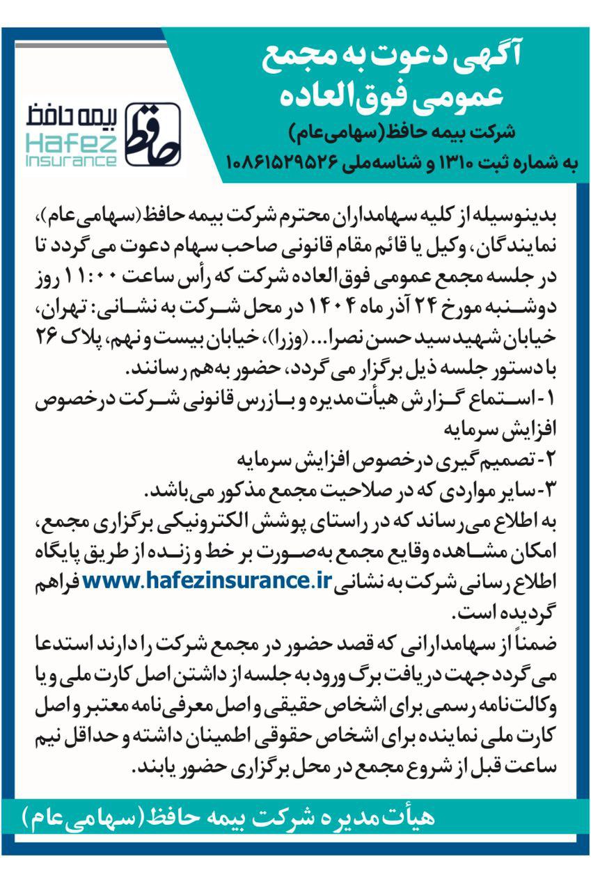 به گزارش روابط‌عمومی شرکت بیمه حافظ، مجمع عمومی عادی به‌طور فوق‌العاده صاحبان سهام این شرکت با دستور جلسه تصمیم‌گیری در خصوص افزایش سرمایه، در روز دوشنبه ۲۴ آذرماه ساعت ۱۱:۰۰ در محل دفتر مرکزی بیمه حافظ برگزار خواهد شد.