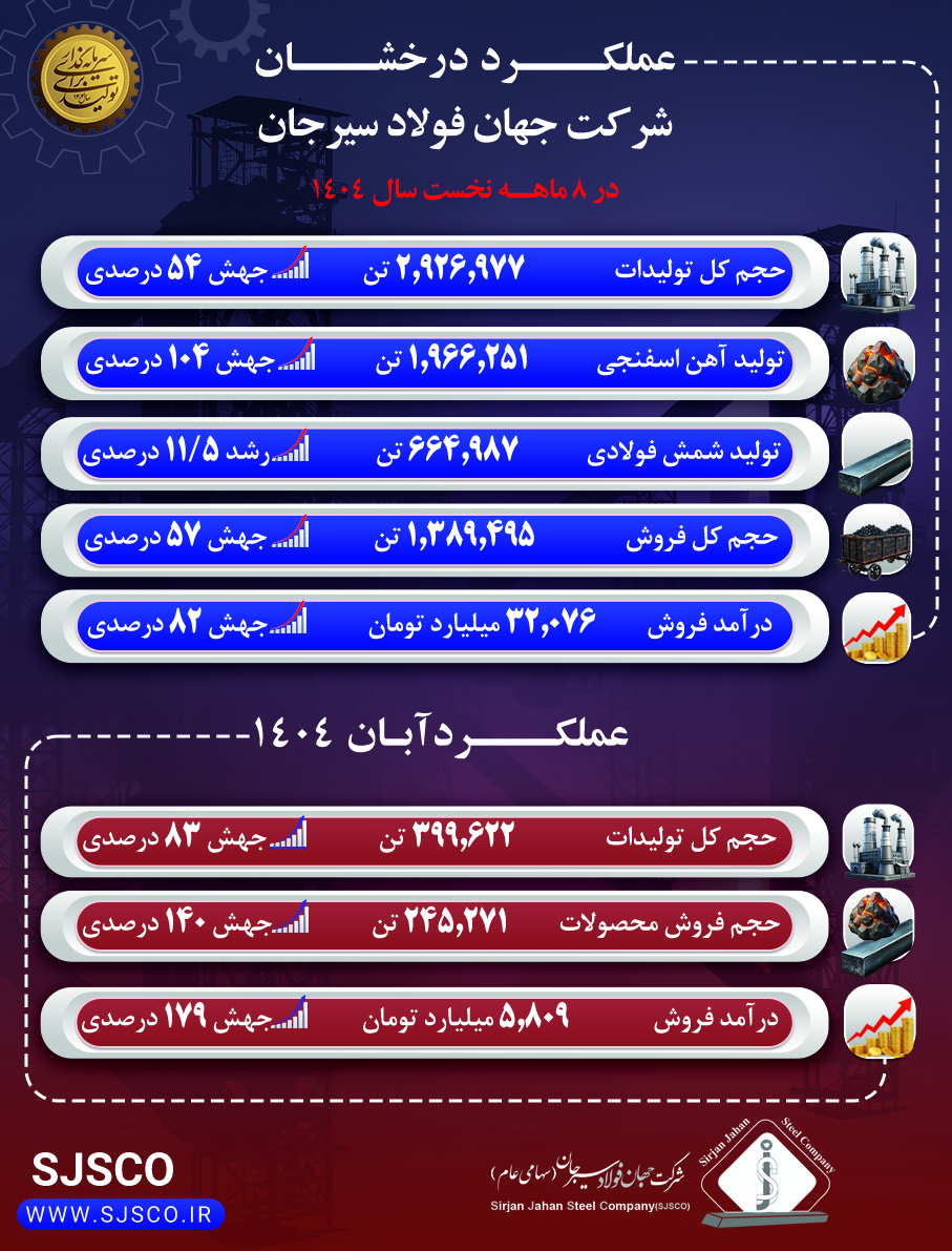 بخش تولید آهن اسفنجی بیشترین سهم را در این جهش تولید داشته و جهان فولاد سیرجان با ثبت ۱ میلیون و ۹۶۶ هزار و ۲۵۱ تن، رشد ۱۰۴ درصدی را نسبت به سال گذشته تجربه کرده است. تولید شمش فولادی نیز با وجود محدودیتهای برق، به ۶۶۴ هزار و ۹۸۷ تن رسیده که نشاندهنده افزایش ۱۱.۵ درصدی است.