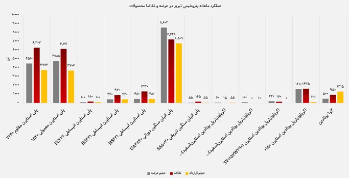 پتروشیمی تبریز در شهریورماه ۱۴۰۴ با عملکردی موفق توانست جایگاه خود را در تالار پتروشیمی بورس کالا تثبیت کند. این شرکت با تنوعبخشی به سبد محصولات شامل پلیاستایرن، پلیاتیلن سنگین دورانی و تزریقی، بنزن، اکریلونیتریل بوتادین استایرن (ABS) و بوتادین ۱و۳، توانست یکی از ماههای پربازده خود را به ثبت برساند.