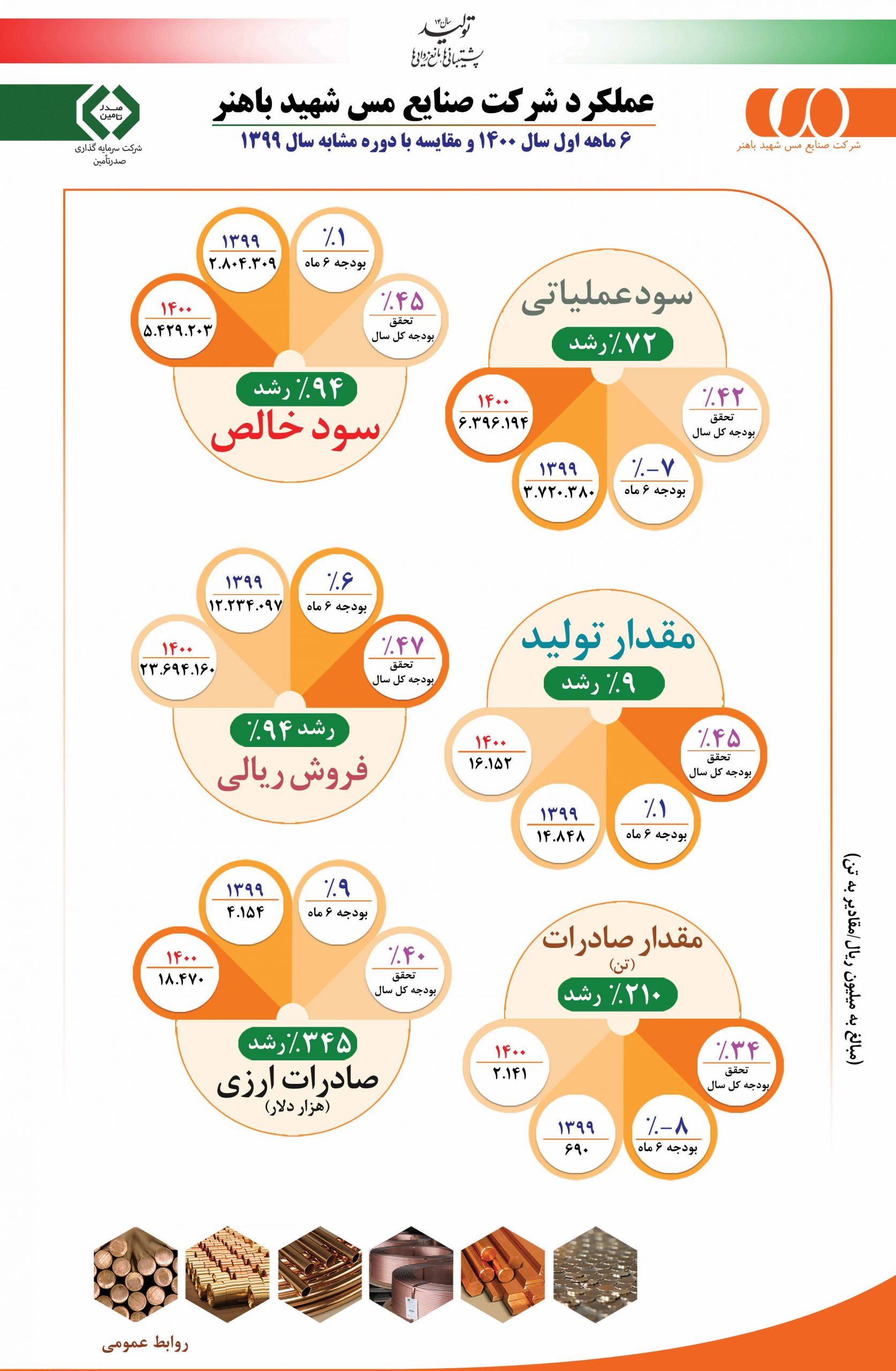 وی افزود: صادرات مس باهنر در دوره ۶ ماهه ابتدایی سال ۱۴۰۰ از نظر دلاری ۳۴۵درصد و با محاسبه ریالی۳۷۵ درصد افزایش داشته و نزدیک به ۳۰درصد از سود تحقق یافته در شش ماهه اول امسال مربوط به صادرات است.