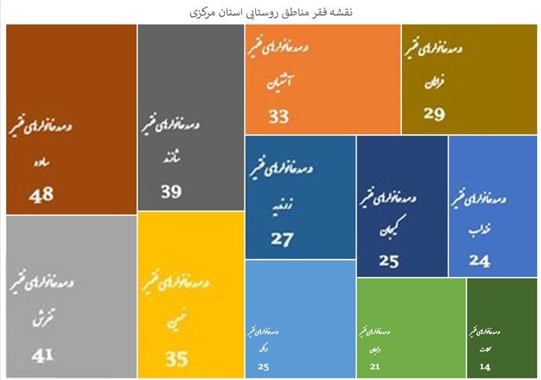 این نقشه فقر نشان میدهد که در سطح مناطق شهری بیشترین سهم فقرا را به ترتیب فراهان، محلات، خنداب، خمین، کمیجان، دلیجان، ساوه، آشتیان، شازند، زرندیه، اراک و تفرش دارند. لذا بررسی عوامل آن بسیار حایز اهمیت است.