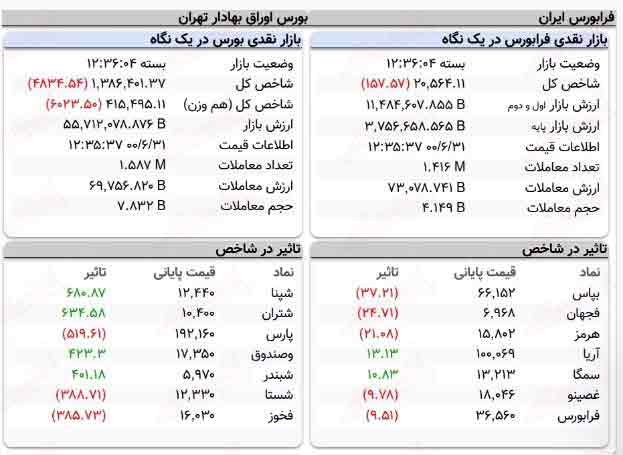 شاخص کل بورس اوراق بهادار تهران در پایان بازار ۰.۴درصد کاهش داشت، شاخص هم‌وزن نیز ۱.۴درصد افت کرد.