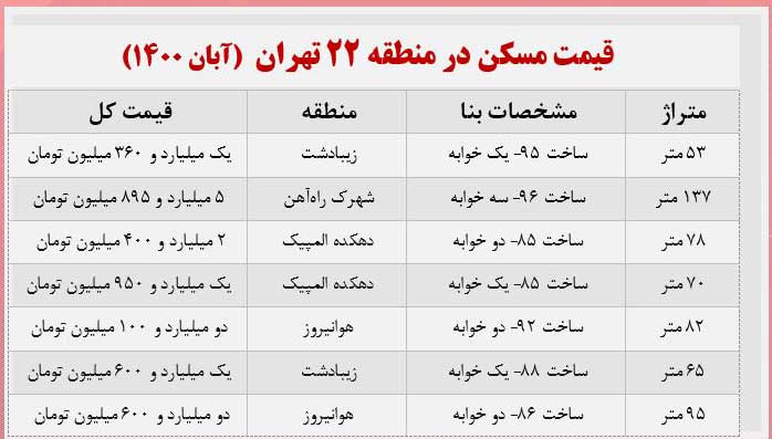قیمت مسکن در منطقه ۲۲ تهران +جدول