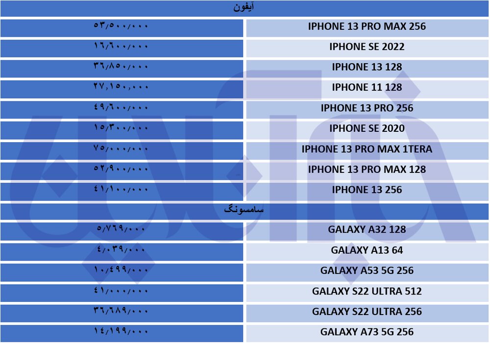 در بین تلفنهای همراه برند سامسونگ مدل ای ۲۲ الترا با ظرفیت ۵۱۲ گیگابایت ۴۱ میلیون تومان قیمت خورده است و مدل دیگر این تلفن همراه با ظرفیت ۲۵۶ گیگابایت نیز ۳۶ میلیون و ۶۸۹ هزار تومان قیمت خورده است.