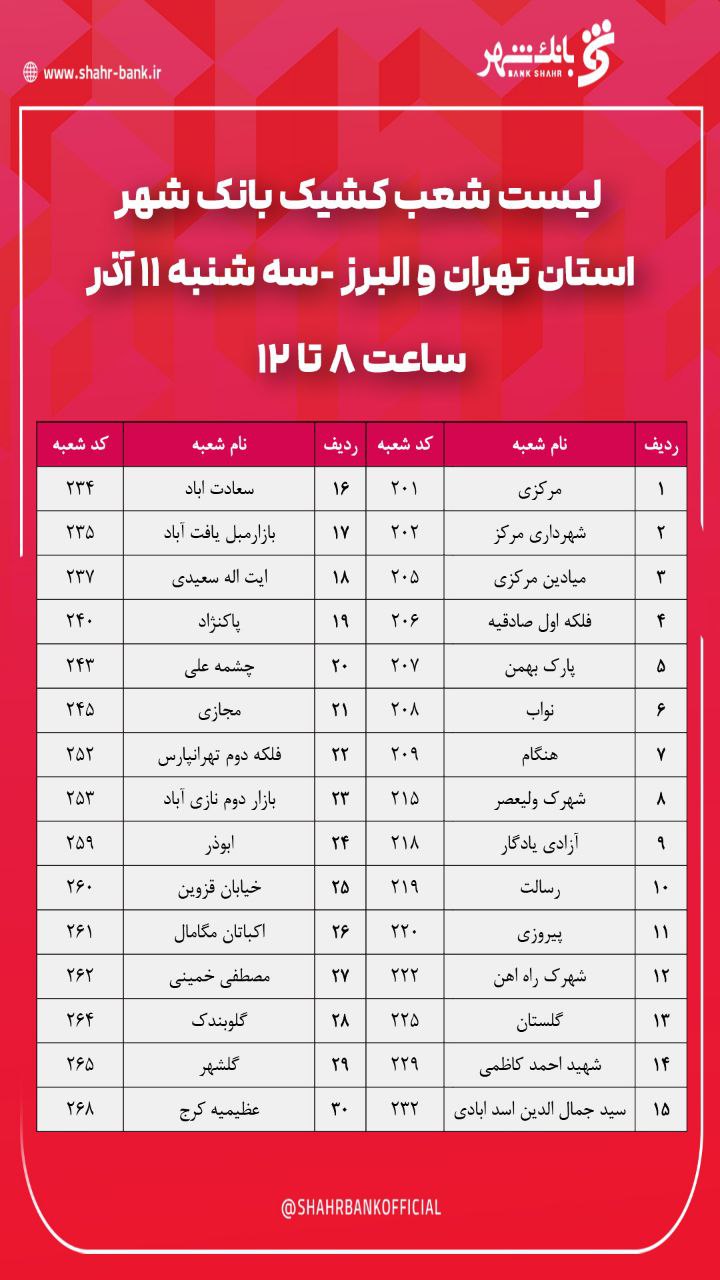 لیست شعب کشیک بانک شهر برای روز ۱۱ آذرماه اعلام شد