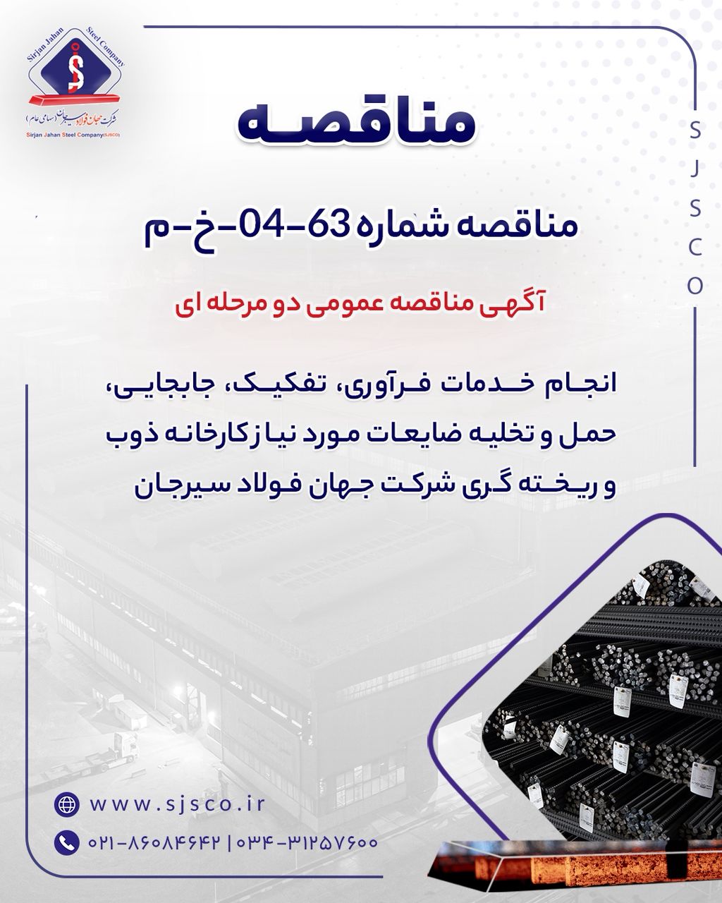 شرکت جهان فولاد سیرجان در نظر دارد نسبت به انجام خدمات فرآوری، تفکیک، جابجایی، حمل و تخلیه ضایعات از طریق برگزاری مناقصه عمومی دو مرحله ای اقدام نماید؛ لذا از تمامی پیمانکاران معتبر بومی استان کرمان که دارای ۲ (دو) سال سابقه کار مشابه، توانایی مناسب، سوابق و تجارب مورد قبول می باشند، دعوت به عمل می آید اسناد مناقصه را از طریق مراجعه به آدرس اینترنتی WWW.SJSCO.IR دریافت نمایند.