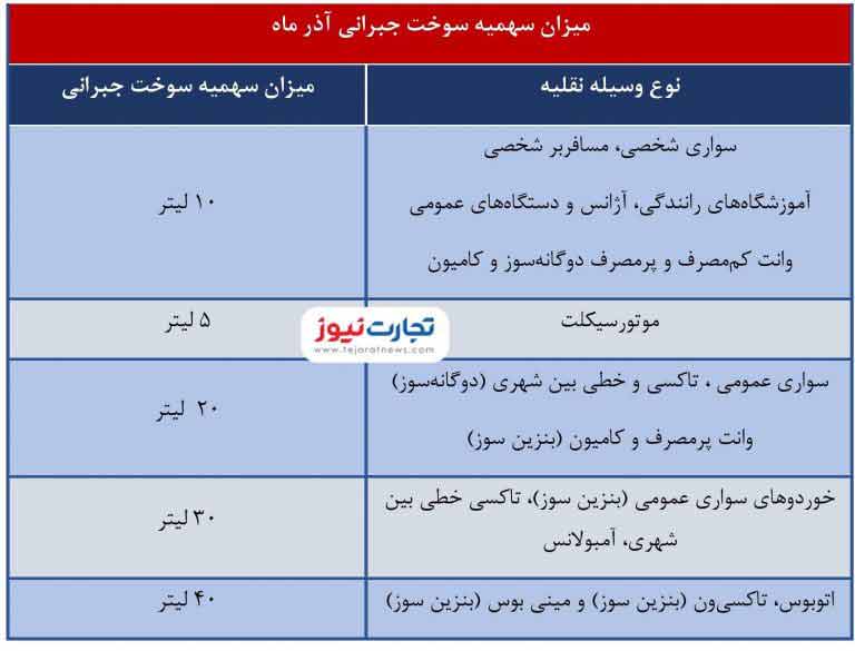 بنا بر اعلام پایگاه اطلاعرسانی دفتر هیئت دولت، هر یک از خودروها بین ۵ تا ۴۰ لیتر سهمیه جبرانی آذر دریافت میکنند.