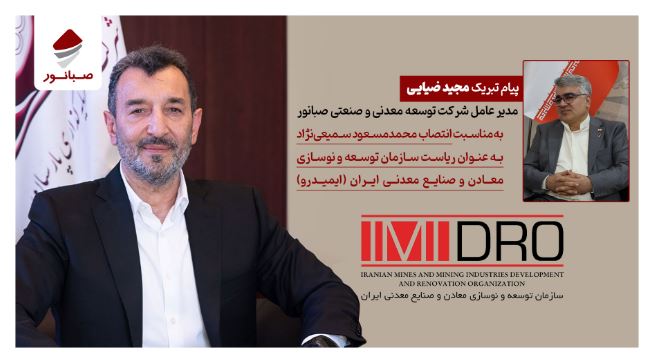 به گزارش روابط عمومی شرکت توسعه معدنی و صنعتی صبانور، مدیرعامل شرکت توسعه معدنی و صنعتی صبانور، در پیامی انتصاب محمدمسعود سمیعینژاد به سمت ریاست هیأت عامل سازمان توسعه و نوسازی معادن و صنایع معدنی ایران (ایمیدرو) را تبریک گفت. متن پیام به شرح زیر است: