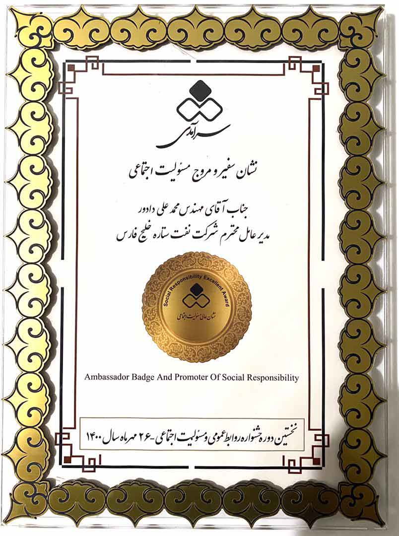 شرکت نفت ستاره خلیج فارس به پاس عملکرد شایسته در حوزه مسئولیت اجتماعی نشان سفیر و مروج مسئولیت اجتماعی را کسب کرد.