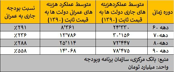 از سوی دیگر میزان هزینه های عمرانی طی ۴ دهه تقریبا ثابت بوده است. هزینه عمرانی دولت به قیمت ثابت نشان میدهد این هزینهها در دهه ۹۰ نسبت به دهه ۶۰ تنها ۶۰ درصد رشد داشته استدر حالی که هزینه های جاری به قیمت ثابت سه برابر شده است.