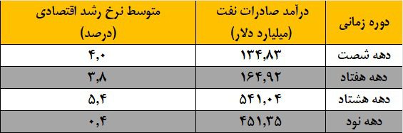 اما نکته تلخ در این میان روند معکوسی است که بین میزان منابع و هزینه کرد دولتها با رشد اقتصادی کشور رخ داده. در دهه ۶۰ رشد اقتصادی کشور با حدود ۱۳۴ میلیارد دلار درآمد نفتی به طور متوسط ۴ درصد در سال بوده؛ در حالی که طی دهه ۹۰ با ۴۵۱ میلیارد دلار درآمد نفتی، متوسط رشد اقتصادی کشور حدود ۰.۴ درصد رسید.